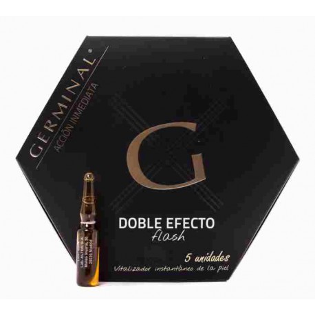 Germinal Acción Inmediata Doble Efecto Flash son 5 ampollas que actúan como un vitalizador instantáneo especial para pieles que requieren un tratamiento tensor más intenso.